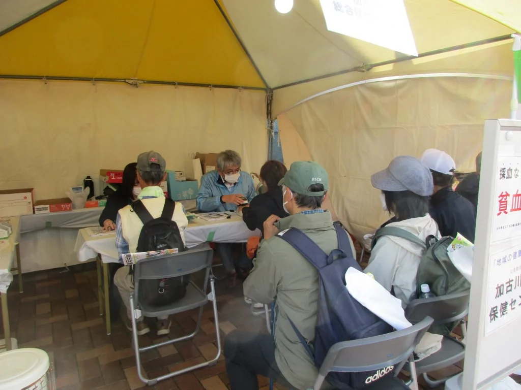 採血のいらない簡易貧血検査を行い152名の方に体験して頂き、参加者の皆様への「ウェルネスへの気づき」への一助となりますよう結果表の裏に人間ドックやがん検診のPRを印刷、かこがわ健康BOXのポケットティッシュを配布いたしました。