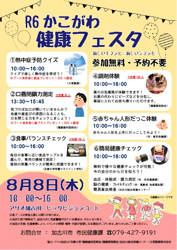 保健センターは令和6年8月8日(木)、アリオ加古川 ビックビジョンコートにおいて「かこがわ健康フェスタ」の簡易健康チェックブースに出展しました。